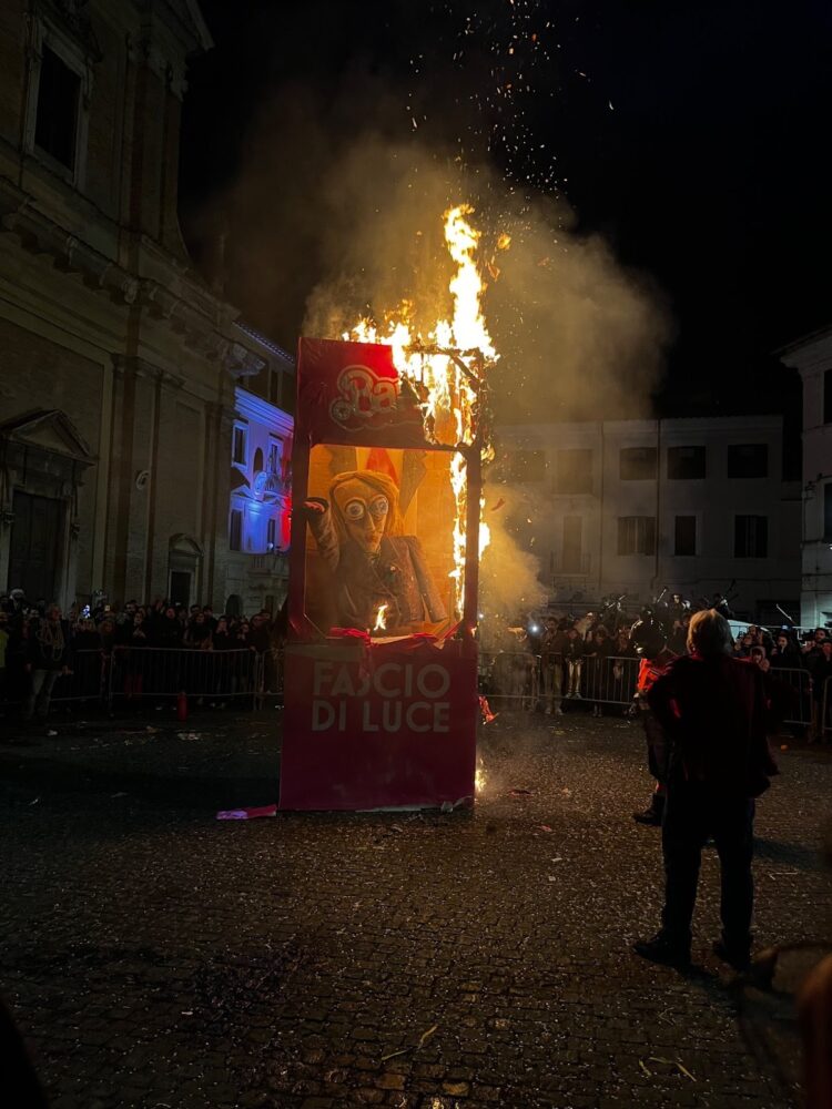 - Il rogo del fantoccio è il momento più cruciale, molto importante per la tradizione del falò: viene bruciato il bammoccio, un fantoccio di cartapesta satirico che raffigura spesso personaggi di attualità politica o simboli di potere (l’anno scorso fu Giorgia Meloni); si tratta di un gesto simbolico per “liberare” la comunità degli eccessi dell’anno passato.